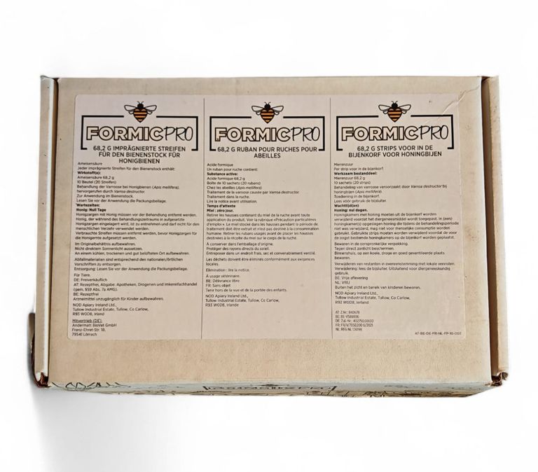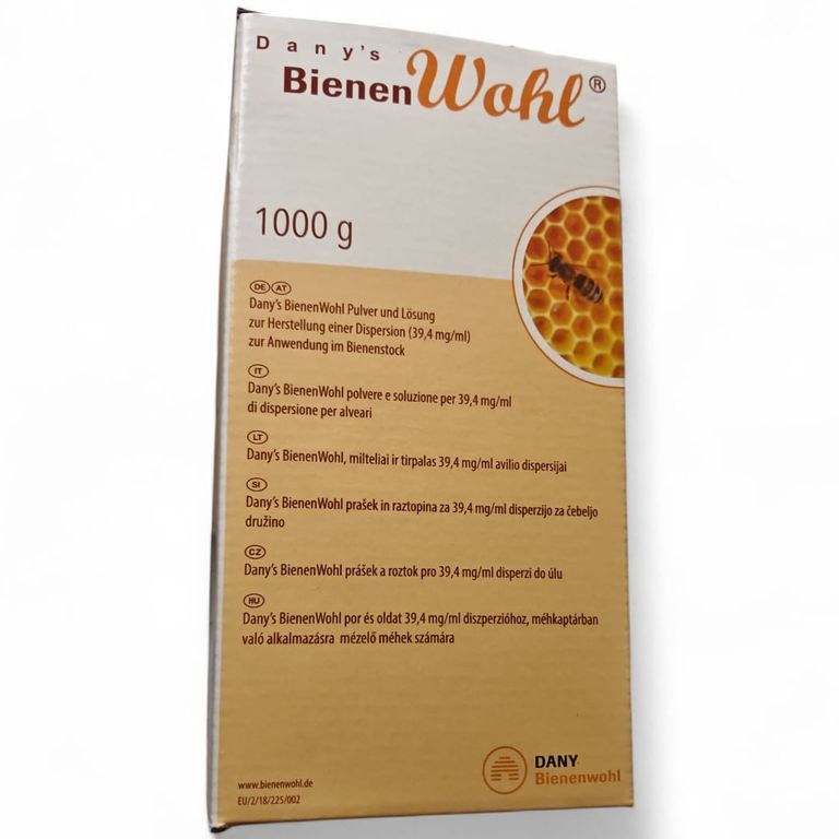 Pulver und Lösung zur Herstellung einer Dispersion (39,4 mg/ml) zur Anwendung im Bienenstock. 1 Flasche mit 750 g Oxalsäure-Dihydrat-Lösung und zwei Beutel (zu je 125 g) Saccharosepulver zur Herstellung von 888 ml Dispersion